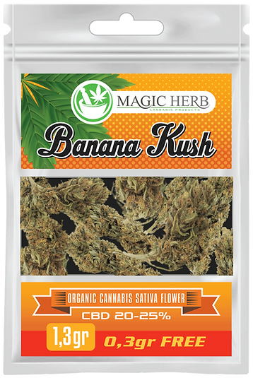 Περιεχόμενο: Κάθε συσκευασία περιέχει 1.3γρ ανθό CBD Cannapark Banana Kush.