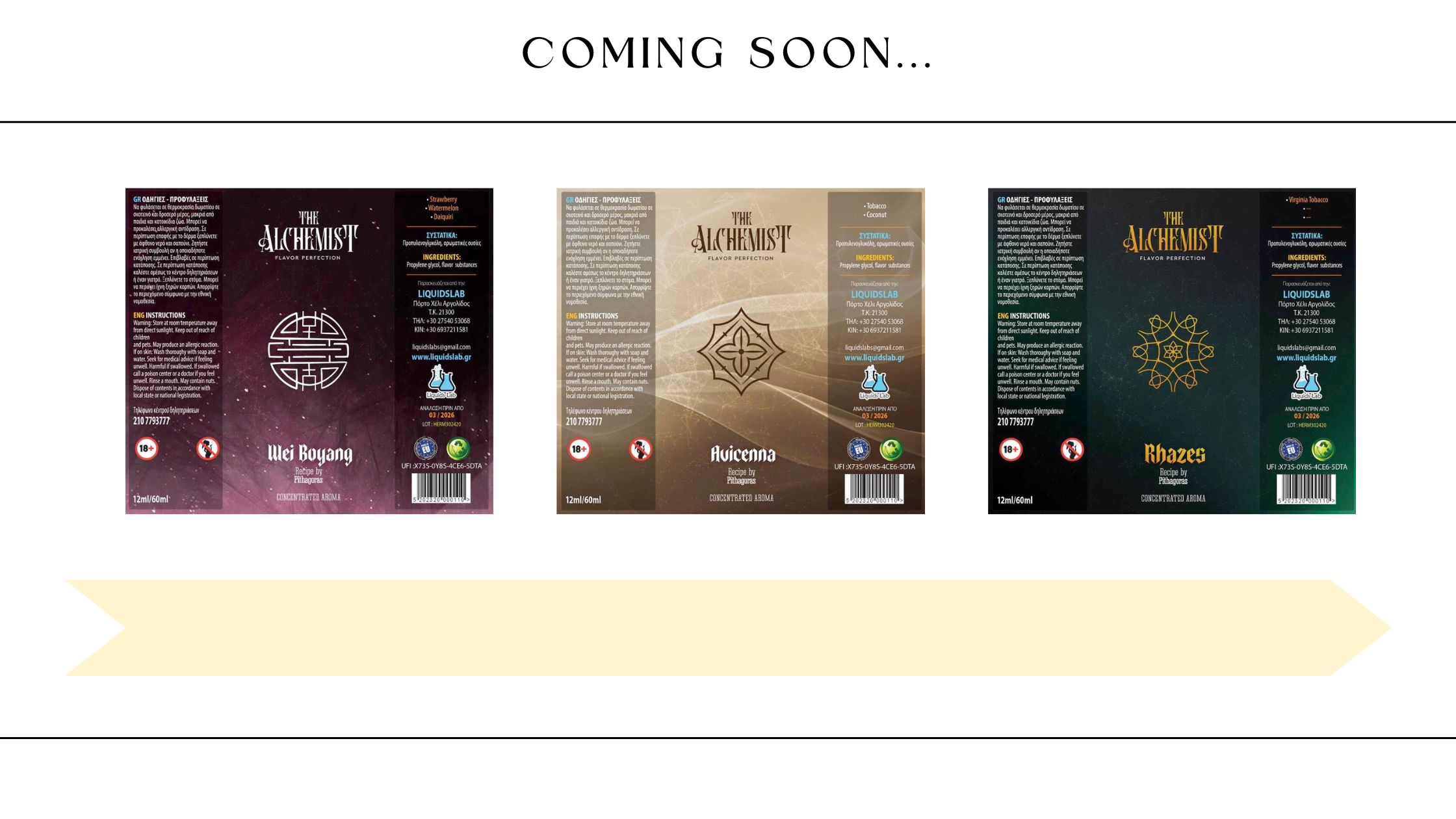 Εγγυημένη ποιότητα σε τρεις διαφορετικές επιλογές έρχονται στην αγορά του Vape να ταράξουν τις ατμιστικές σας συνήθειες. Το Aviccena, ένα δυνατό καπνικό με νότες καρύδας και το Rhazes, καπνικό virginia φαντάζουν οι καλύτερες επιλογές για τους λάτρεις των καπνικών υγρών. Τέλος, το ΅Wei Boyang, είναι μια πρωτότυπη μίξη φρούτων και cocktail με καρπούζι, φράουλα και Daiquiri.Ανυπομονούμε να τα δοκιμάσουμε